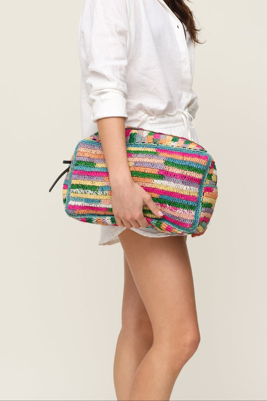 The Large Cosmetic Bag is a bold and vibrant accessory perfect for travel or everyday use. Its rainbow woven design and oversized shape make it a fun yet functional statement piece for carrying all your beauty essentials.